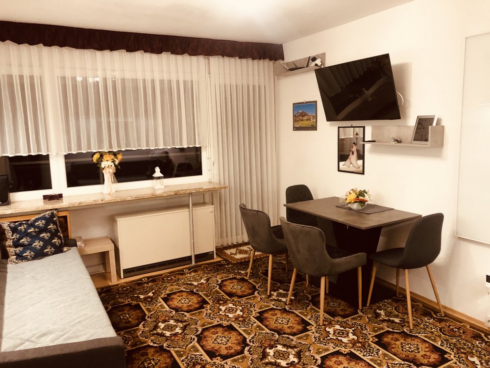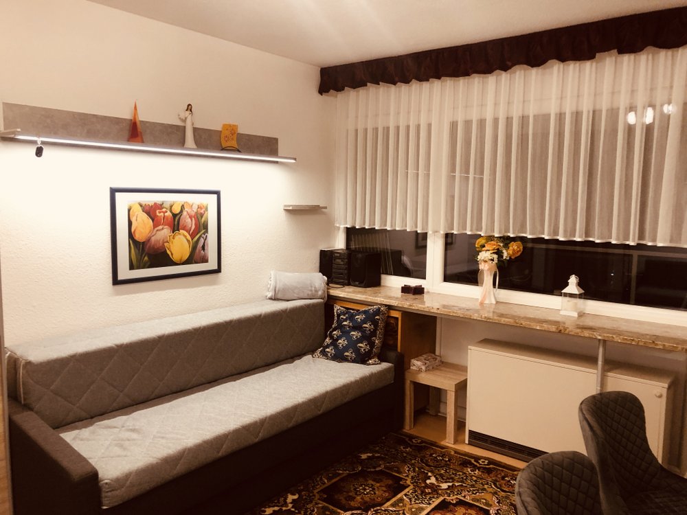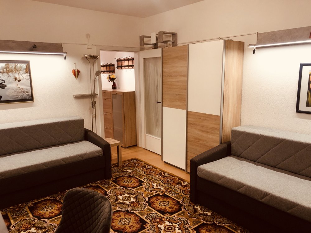 - obývacího pokoje (dvě rozkládací pohovky (2×1,6m), 2 konferenční stolky, šatní skříň, jídelní stůl se čtyřmi židlemi, TV se satelitními českými programy, WIFI připojení).